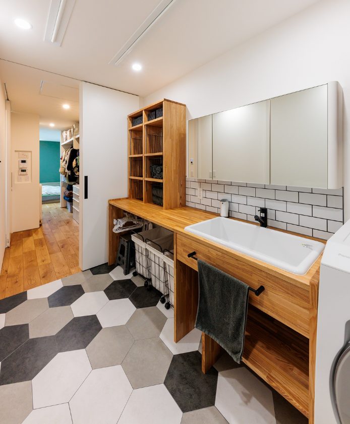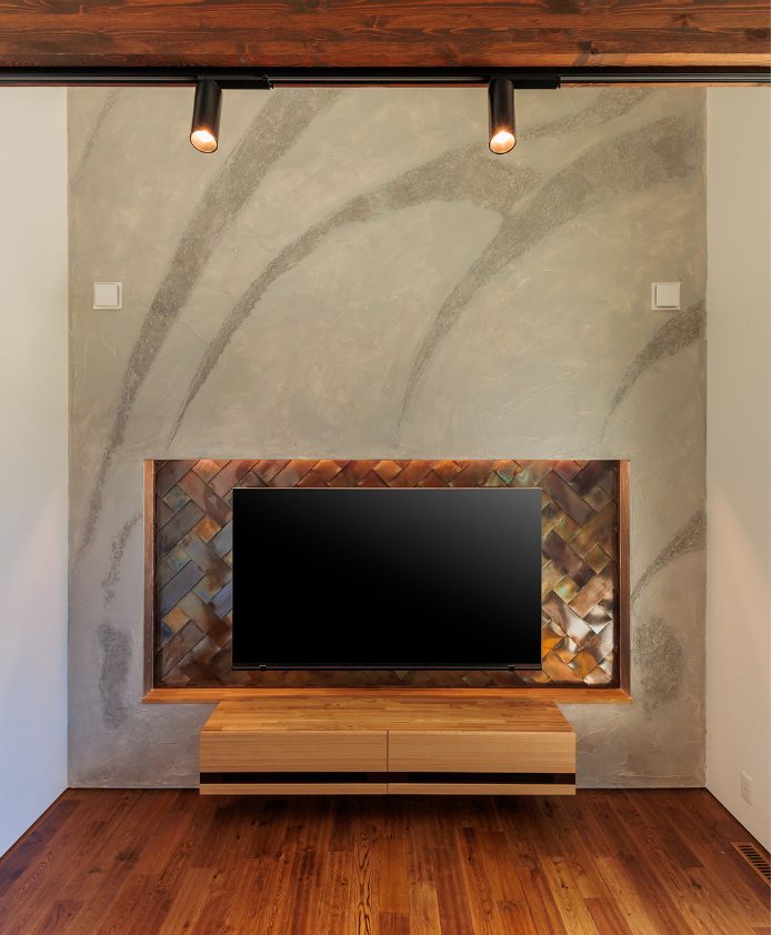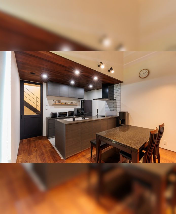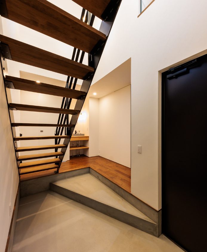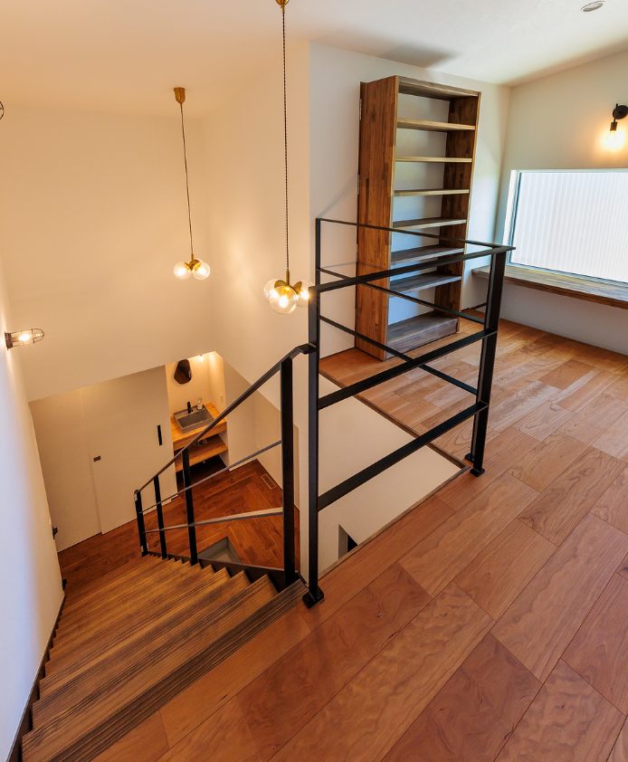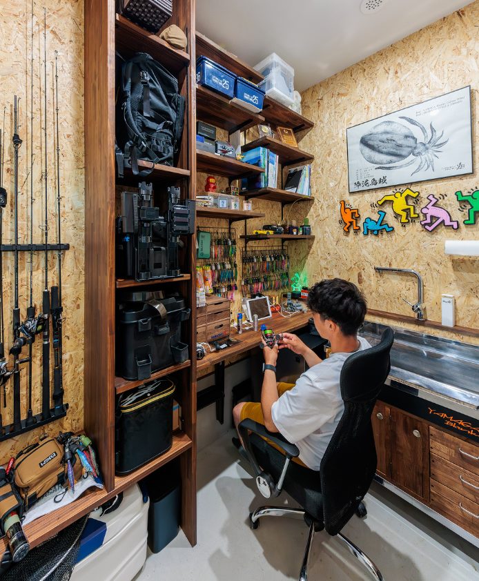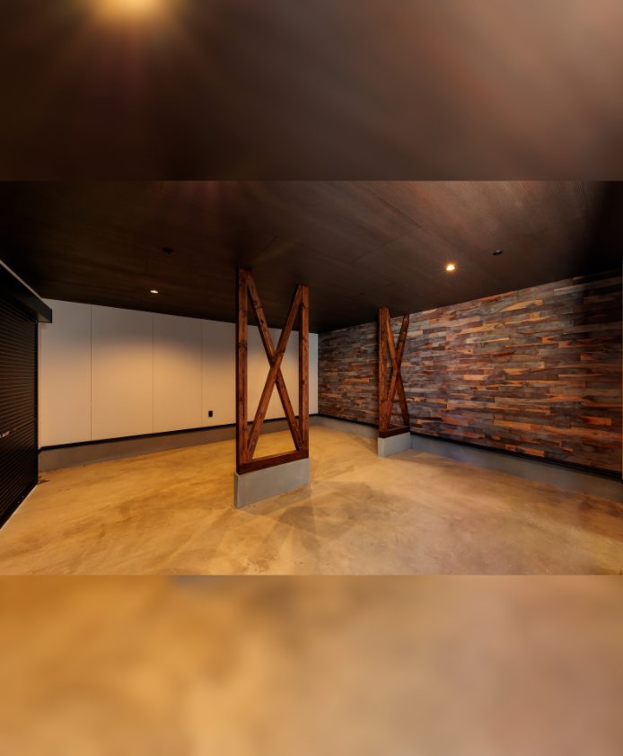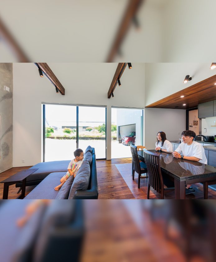 趣味も暮らしも楽しむ 釣り好き夫婦のガレージハウス N様邸 延べ床面積 156.91㎡(47.46坪) 竣工日 2025年3月 エリア 南国市 大きなガレージと趣味室を行き来できる動線と、勾配天井の開放的なLDKの一角にはご主人様お手製の鋼板で織りなすオリジナル壁が魅力的な住まい。