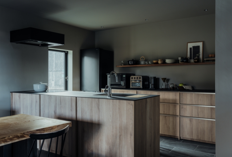 扉を開けた瞬間広がるのは、ダイニングとしての土間。天高約5mのリビングルームを抜けた先の階段から覗く借景が時の季節の移ろいを美しく感じさせます。